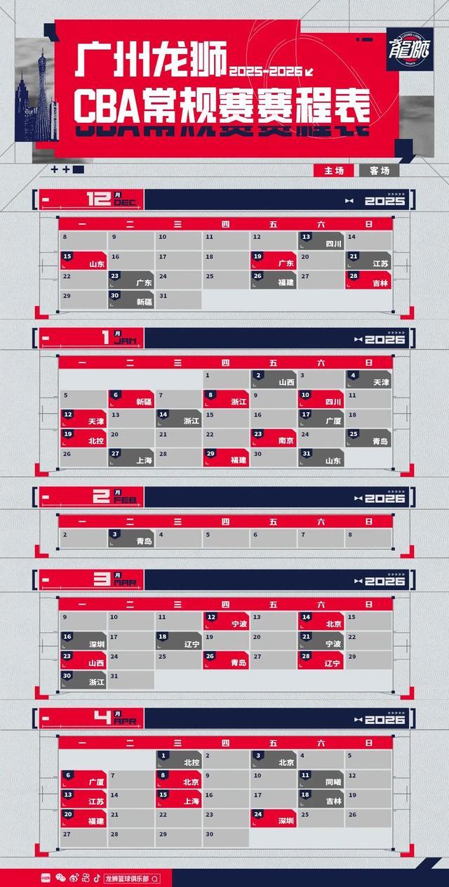 前行无畏广州龙狮20252026赛季CBA联赛常规赛赛程图