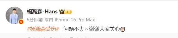 北京时间1月14日,开拓者97-119不敌勇士。杨瀚森赛后更新社媒报平安,他晒出了一张自己的照片,并配文写道:“问题不大,谢谢大家关心。”