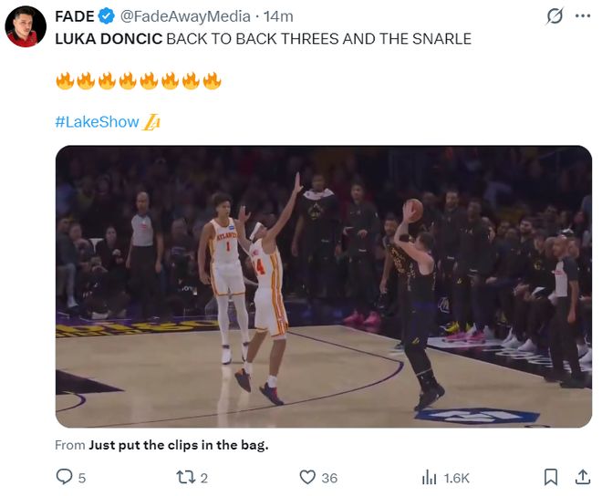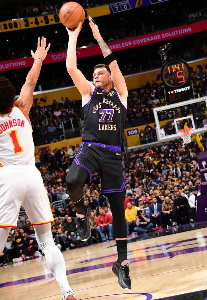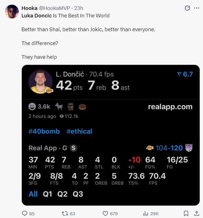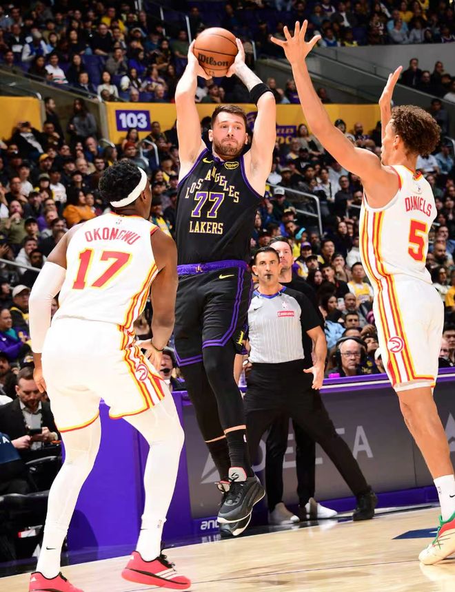 上半场湖人81分创造2024年后的新高,半场12个三分也是赛季新高,东契奇18分钟,三分6中5拿到23分7助攻3篮板1盖帽,除了三分球就是罚篮没有任何一个两分球。