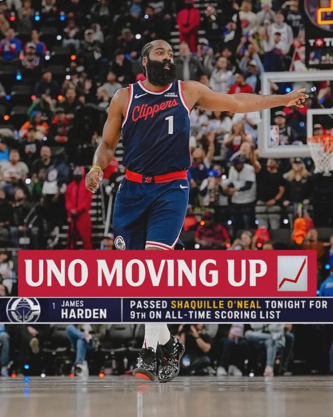 当比赛结束时,哈登的数据定格在32分、10次助攻和4次抢断,率领快船取得了近12场比赛中的第10场胜利,他的职业生涯总得分来到28614分,正式排名NBA历史得分榜第九。